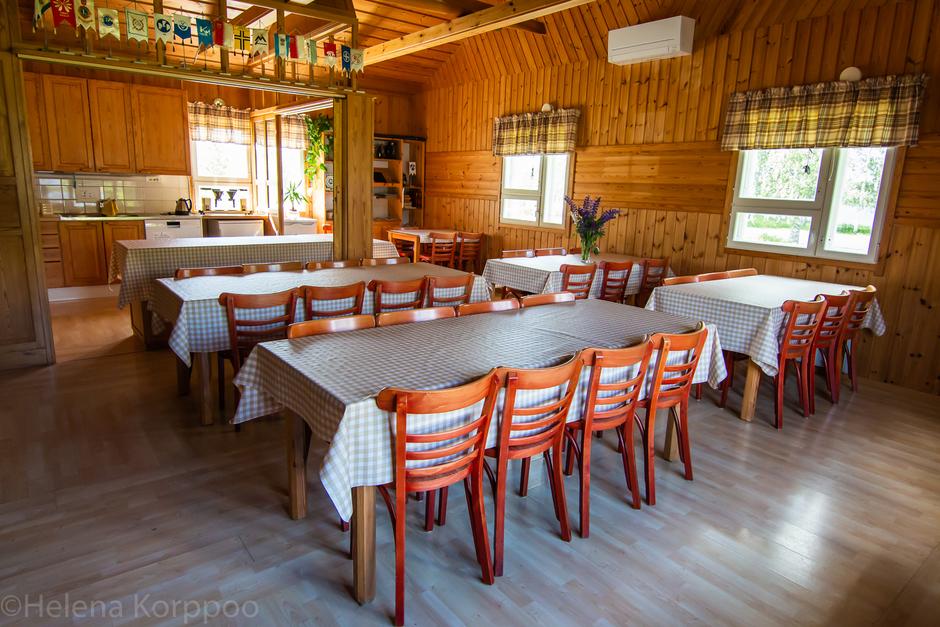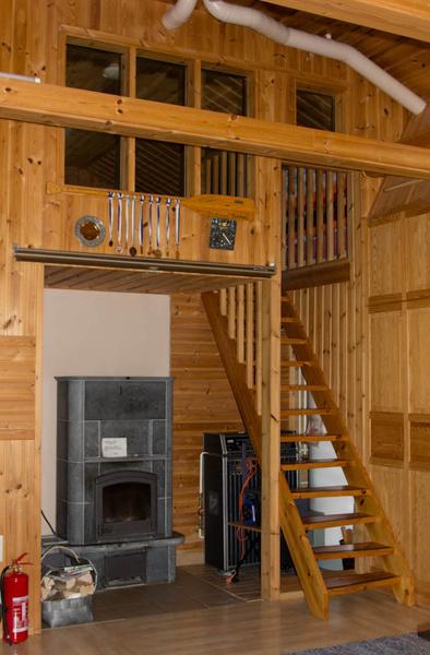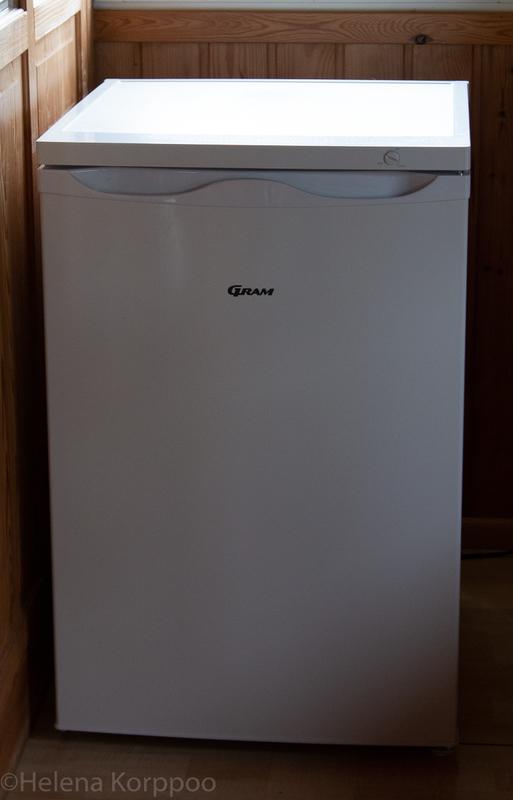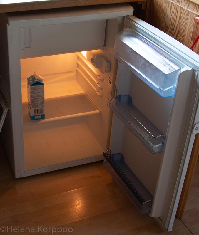 Pirttiin on hankittu tuolit. Seinät ja ikkunat on suorassa, laajakulmaobjektiivi vääristää.